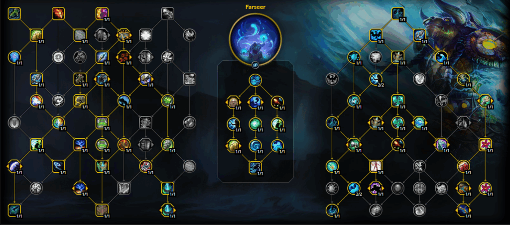 The War Within expands our arsenal of talent options, which include our new talent hero talent trees, Farseer and Totemic. We’ve noticed more representation out of Farseer thanks to healing buffs introduced in patch 11.1. These targeted both our throughput as well as the amount of healing our Farseer ancestors can produce. This makes Farseer our go-to build as opposed to Totemic.