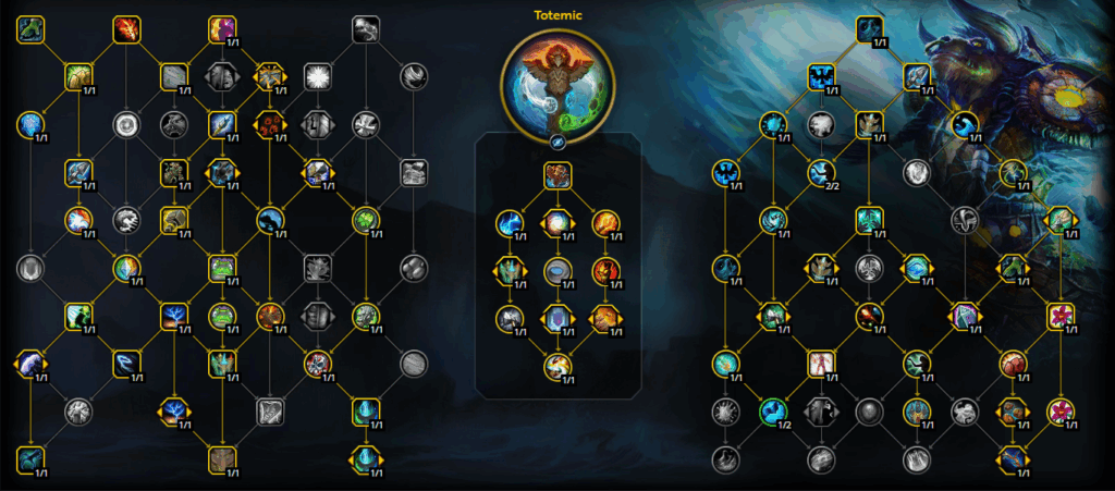 Next up we have our Totemic loadout, which is comprised of heavy AoE healing primarily through our hallmark node, Surging Totem, as well as Chain Heal.